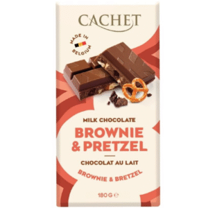 Czekolada Cachet Brownie & Pretzel mleczna to wyjątkowa tabliczka, która wyróżnia się na tle innych słodyczy oryginalnym połączeniem smaków i tekstur. Aksamitna mleczna czekolada została wzbogacona kawałkami miękkiego, czekoladowego brownie oraz chrupiącymi preclami, tworząc harmonijną kompozycję słodyczy i lekko słonej nuty. Produkt wykonany jest z wysokiej jakości składników, co gwarantuje intensywny smak, kremową konsystencję i przyjemne, chrupiące akcenty w każdym kęsie.